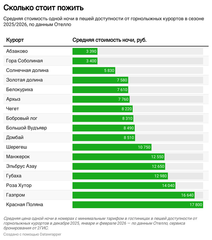 Самыми затратными направлениями, как и прежде, остаются курорты Краснодарского края. Лидером по стоимости стал «Газпром» (27,6 тыс. руб. в день), за которым следуют «Красная Поляна» (26,3 тыс. руб.) и «Роза Хутор» (25,1 тыс. руб.). При этом сочинские курорты не теряют популярности и возглавляют рейтинги по количеству бронирований.